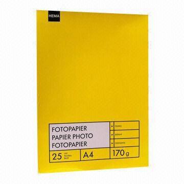 Surface finish: glossy, matte, silky, satin and rough satin Coating: resin Waterproof or non-waterproof Self adhesive or without adhesive Ink: dye/pigment High glossy photo paper: Sizes: A2, A3, A4, A5, A6, 3, 4, 5R, 185x275mm, 24/36 inchesx30m Single side: 110, 130, 150, 160, 180, 210, 230, 260gsm Double side: 160, 180, 210, 240, 250gsm Self-adhesive photo paper: Matte: 110, 130, 150, 180gsm with A3, A4, A5, A6 Glossy: 130, 150, 180, 200gsm with A3/A4/A5/A6 CD/DVD glossy label: 110, 130, 150gsm, 135x270mm, hold 2 CD/DVD labels CD/DVD matte label: 130/150gsm, 135x270mm, holds 2 CD/DVD labels Matte coated inkjet photo paper: Single side: 110/130gsm with A2, A3, A4 sizes, 24/36 inchesx30m Double side: 140, 230, 250gsm with A2, A3, A4 sizes Sizes: A2, A3, A4, A5, A6, 3, 4, 5R, 24/36 inchesx30m Weight: 180, 230, 260, 280gsm